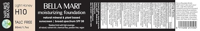 Natural Moisturizing Foundation by Bella Mari (Light Honey H10, 1.7 Fl Oz Glass Jar) - Made with Organic Ingredients - No Toxic Synthetic Chemicals - TSA-Approved Travel Size