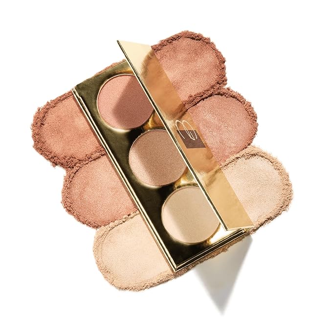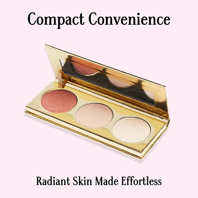 - THREE RADIANT SHADES: Each face palette contains three stunning powder highlighter shades. 'Lucy' is a super pigmented rosy pink highlighter with a hint of gold, 'Marilyn' is a luminous pale gold highlighter, and 'Grace' is a pearlescent metallic white highlighter.