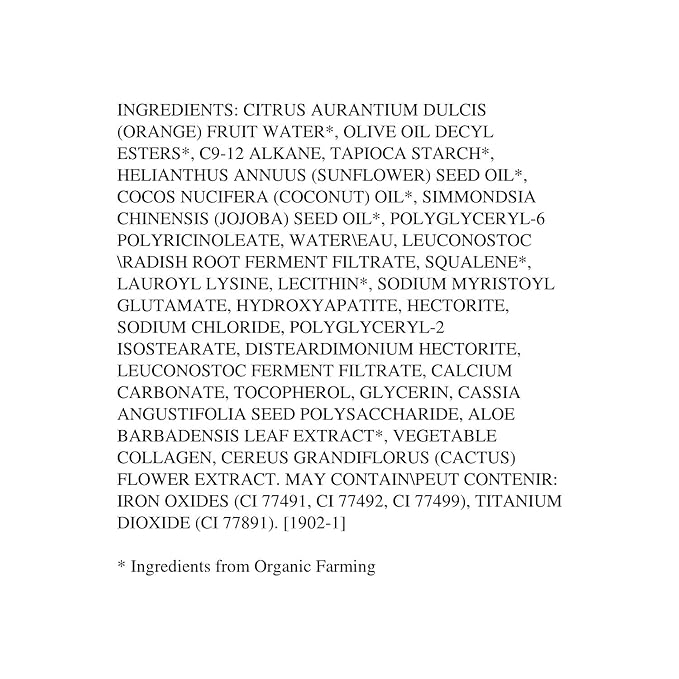 - Ultra-nourishing, ultra-fluid, and weightless organic foundation elixir.