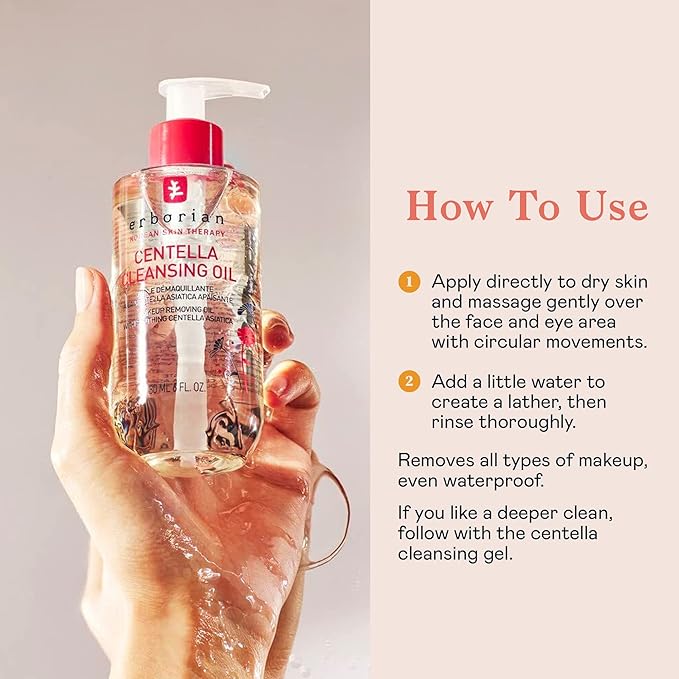 - Erborian Centella Cleansing Oil: This ultra-fine cleansing oil removes excess sebum, impurities, and even waterproof makeup while maintaining the skin's natural hydration. On contact with water, its light texture transforms into a milky lotion that works to remove makeup quickly, without leaving a greasy residue. 6 fl oz.