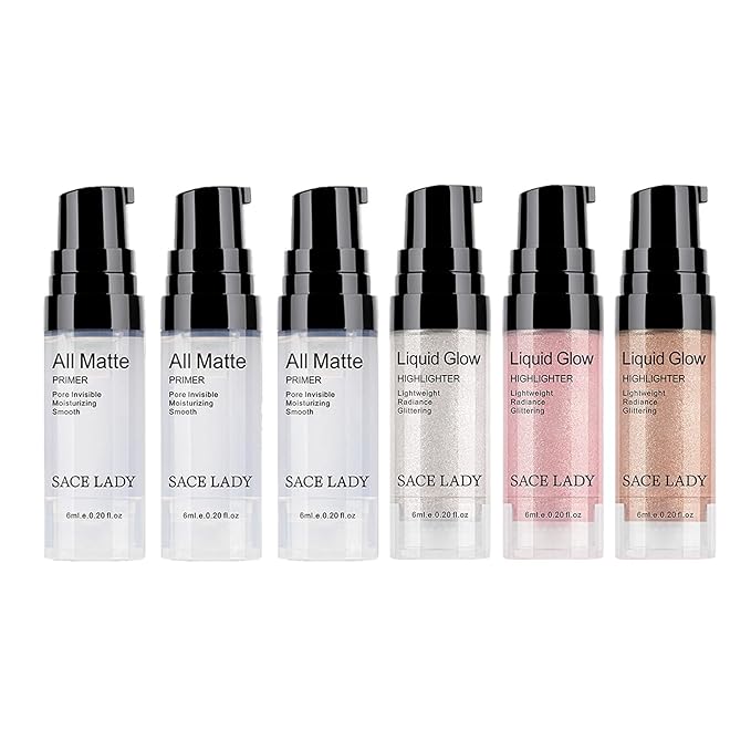 - 3PCS LIQUID HIGHLIGHTERS & 3PCS PORE PRIMERS FACE MAKEUP SET. This makeup set including 3pcs shimmer shine highlight face glow and 3pcs blurs pores makeup primer, travel-friendly, perfect for on the go.