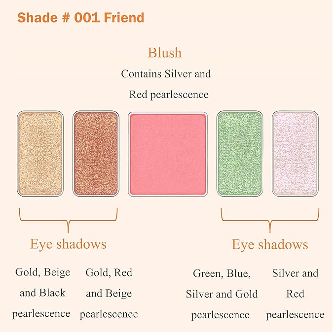 - Each palette contains four eyeshadow colors and one blush color. The eyeshadows employ a highly sheer product base for superior color intensity and pronounced pearlescent shimmer. The blush colors are formulated for soft and gauzy looking results.