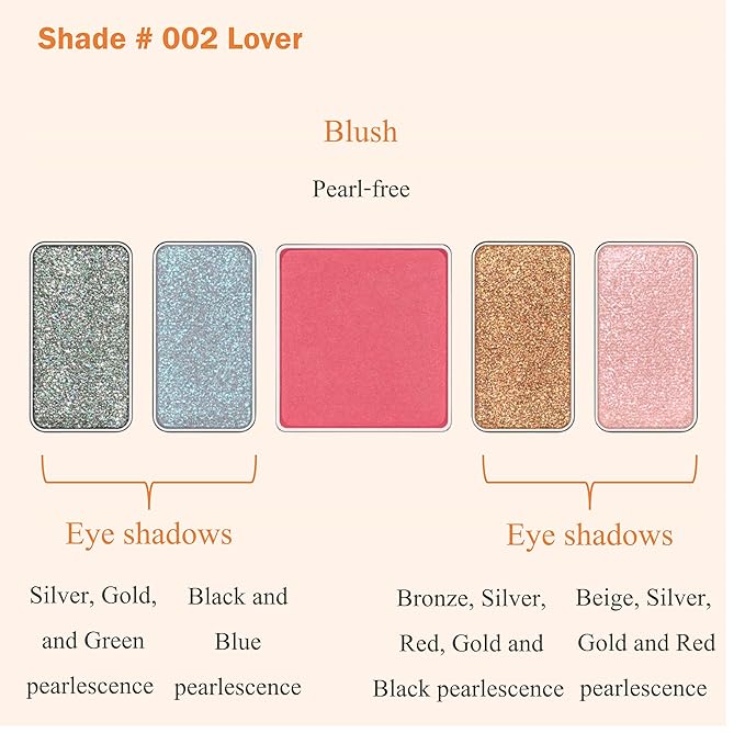 - The colors of the 002 palette include: Sensual Gray Eyeshadow (with gold and green pearlescence, and large pearlescent particles in silver) Stone Gray Eyeshadow (with black pearlescence and large pearlescent particles in blue) Pure Red Blush (with pearl-free) Warm Brown Eyeshadow (with bronze, silver, red, gold and black pearlescence) Sweet Pink Eyeshadow (beige, silver, gold, and red pearlescence)