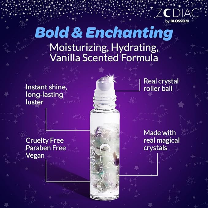 - ZODIAC CRYSTAL BLOSSOM LIP GLOSS: Instant, long-lasting, high shine lipgloss with crystals to align with your cosmic sign. Available in all 12 zodiac signs (Aries, Taurus, Gemini, Cancer, Leo, Virgo, Libra, Scorpio, Sagittarius, Capricorn, Aquarius, and Pisces) and make the perfect gift for those astrologically inclined