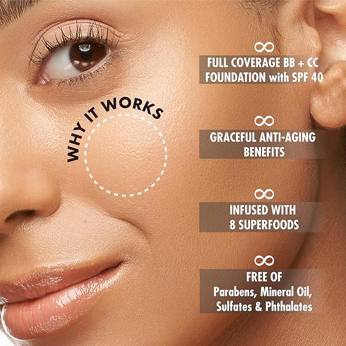- SUPERFOOD GLOW: Achieve a natural and flawless look with our all-in-one BB, CC, and full coverage foundation that gives your skin a radiant, healthy glow.