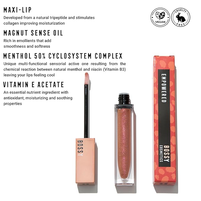 - MOISTURIZER: Our Bossy lip gloss consists of a sheer, lightweight, non-stick texture, and is enriched with ingredients that will leave your lips looking and feeling naturally enhanced. The gloss is made up of Maxi Lip, a compound known for its volumizing and moisturizing effect, as well as MagNut Sense Oil and Vitamin E which leave lips feeling soft and smooth.
