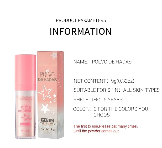 - 【Perfect Gift】Micro-pearl, the Polvo De Hadas, fairy highlighter blush powder brightens the contour, non-greasy, refreshing texture that helps to cover excess oil, and is not easy to clog skin pores. Easy to spread, easy to apply, easy to apply makeup. For those around you who like highlighter makeup! It is easy to carry, has natural luminescence, suitable for various occasions. Ideal gift for yourself or your friends, girlfriend, or wife as a birthday, Hallowmas, Christmas, or holiday gift.
