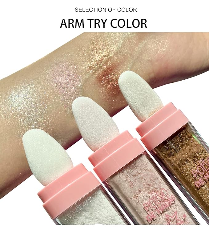 - 【Face & Body Shimmer Highlighter Powder】Polvo De Hadas, fairy shimmer highlighter powder & blush stick duo, Easy easy coloring, sublime shimmer. The highlighter stick with luminous ingredients can create an ultra-shimmer makeup effect and leave skin sun-kissed and luxuriously soft. The instant highlighter Sponge stick design is very convenient to use, and it is suitable for both face and body, making the body glowing and the face become more eye-catching.