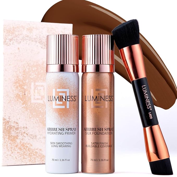 - Flawless Complexion: Cover imperfections, fine lines and wrinkles with the LUMINESS Airbrush Spray Silk Foundation Starter Kit. Achieve an airbrushed look with primer and foundation spray formulated with hydrating ingredients to replenish and lock in moisture. Includes 1 Hydrating Primer, 1 Silk Foundation, and 1 Dual Sided Angled Buffing Brush L400. Foundation Shade: Deep Dark