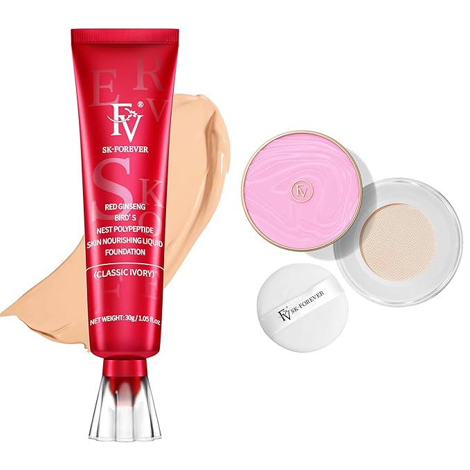 FV Foundation, Oil Absorb Classic Ivory Liquid Foundation with FV Setting Powder, Lightweight Sooth Poreless Matte Nature Makeup Powder