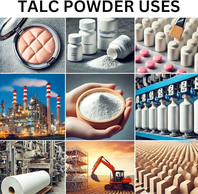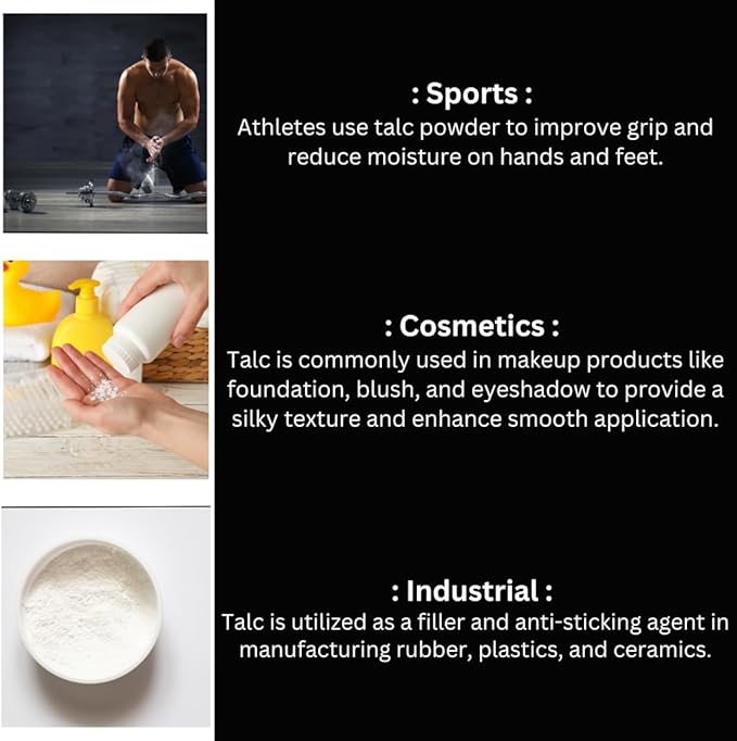 - Uses - Talc is used in a large number of cosmetic products such as antiperspirants powdered foundation, hygiene products and baby care products, and various other makeup products because of its multiple properties and benefits. It is used for its absorbing properties and transparency giving a soft and smooth finish to the skin