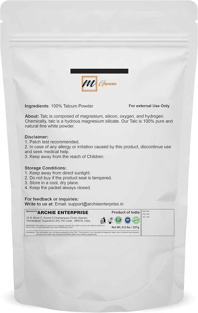 - Quality of Talc - mGanna only uses cosmetic grade talc. There are many grades of talc, categorised according to levels of purity. At the top of this purity scale is cosmetic grade talc, which meets the highest levels of quality and safety.
