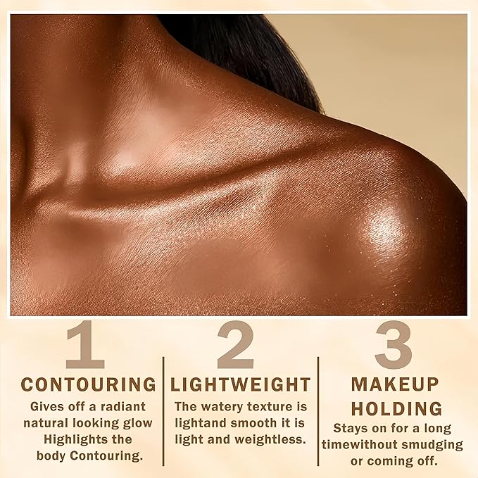 - 【Sun-kissed Shimmer Glow】This Body Luminizer give you a subtle shimmer, just like lightly sun kissed. It added a beautiful highlighting shine to the skin without a super glittery looking effect. A little goes a long way.