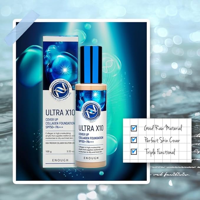 - Recommended Uses For Product : Daily Sun Protection: Use the Enough Ultra X10 Cover Up Collagen Foundation daily to protect your skin from harmful UV rays with SPF 50+ PA+++, preventing sun damage and premature aging., Hydrating Moisturizer: Acts as a hydrating moisturizer, keeping your skin nourished and moisturized throughout the day, making it perfect for dry skin types., Anti-Aging Benefits: Infused with collagen, this foundation helps to improve skin elasticity and reduce the appearance of fine lines and wrinkles, promoting a youthful and radiant complexion., Full Coverage Makeup: Achieve a smooth and even skin tone with full coverage to conceal blemishes, dark spots, and imperfections, providing a flawless finish. Daily Sun Protection: Use the Enough Ultra X10 Cover Up Collagen Foundation daily to protect your skin from harmful UV rays with SPF 50+ PA+++, preventing sun damage and premature aging., H… See more