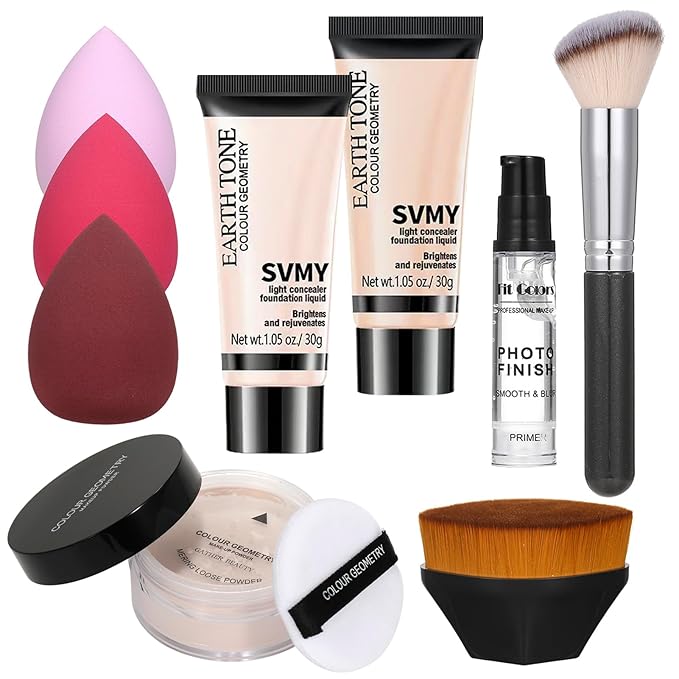Foundation Kit Full Coverage Foundation Primer Powder Makeup Set Kabuki Makeup Brushes Foundation Brush Powder Brush 3 Pcs Makeup Sponge