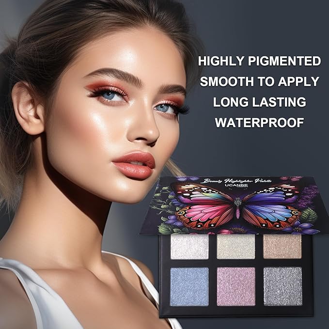 UCANBE Beauty Highlighter Makeup Palette - 6 Colors Shimmery Powder Makeup Palette Pearl White Blonde Blue Purple Silver Face Illuminator Palette Smooth Long Lasting Waterproof Blush Bronzer Kit