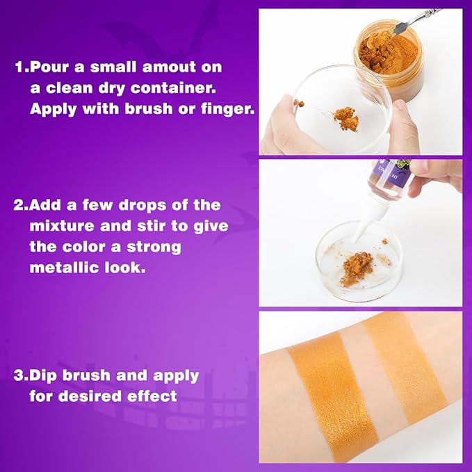 - 💛Widely Used: Pro face body paint metallic powder kit is suitable for a wide range of looks, such as Halloween SFX special effects, Christmas highlight makeup, photoshoot, vampires, shark mermaid, fantasy glam, futuristic tech, stage performances, the Tin Man, face & body painting, cosplay. Mixed with any loose pigment can be used to create eyeliner, eyeshadow and more. SFX makeup Metallic powder can also creat nail art or DIY resin crafts.
