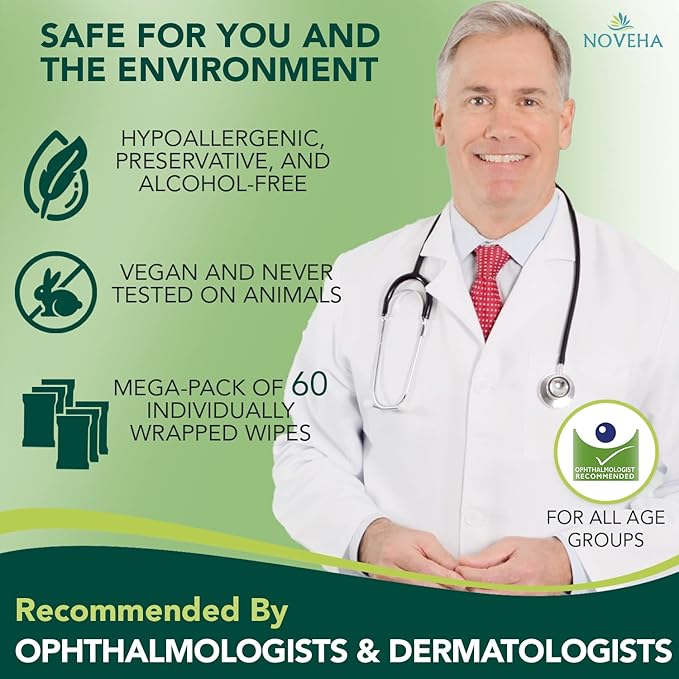 - RECOMMENDED BY DOCTORS AND OPHTHALMOLOGISTS: Our eyelid wipes undergo meticulous inspection for safety and quality, are recommended by doctors, and are safe to use for all ages. It’s time to start treating your eyes like they really deserve. Click ‘Add to cart’ and order your very own NOVEHA daily hypoallergenic eye wipes TODAY!