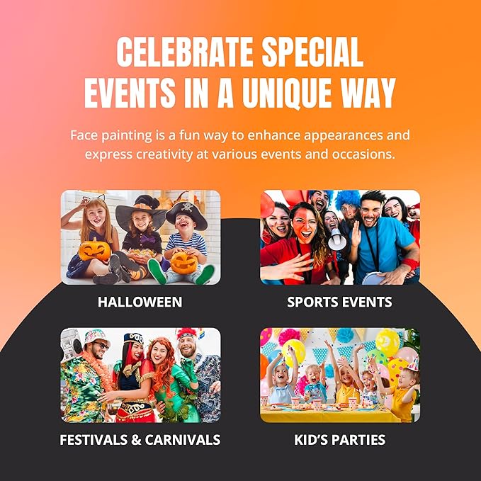 - Complete Spectrum: Dive into a world of face painting using our exceptional water based face paint. This remarkable feature ensures your artistic designs remain intact, even in the midst of spirited Halloween parties
