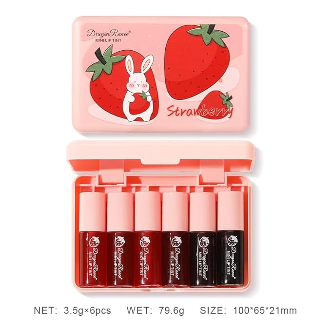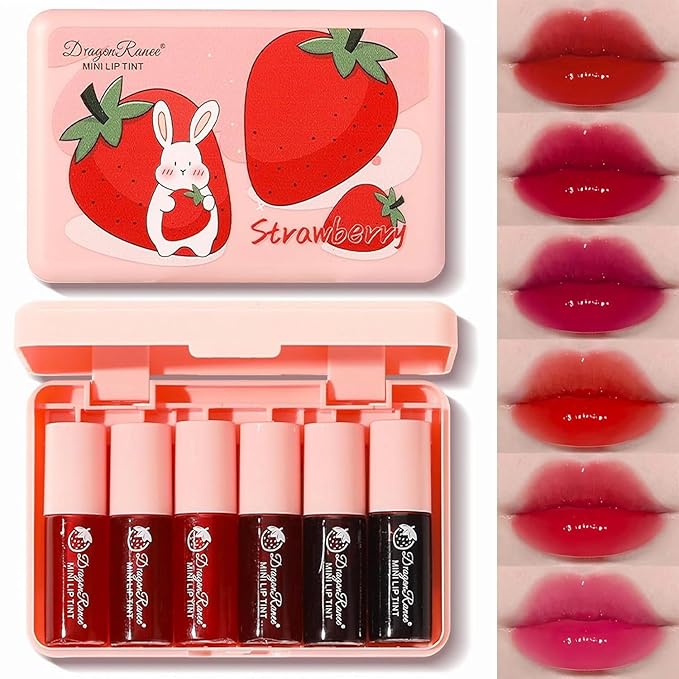 6 Colors Lip Tint Stain Mini Liquid Lipstick,Strawberry Lip Tint Moisturizing Natural Lip Gloss,Multi-Use Lip and Cheek Tint,Non-Stick Cup,Lightweight,Vivid Color Lip Makeup