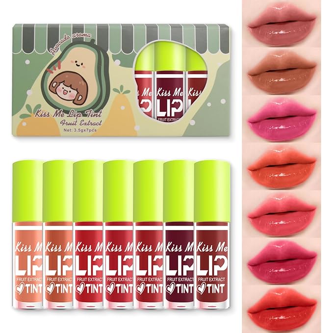 7 Colors Lip Tint Stain Set, Watery Lip Stain Mini Liquid Matte Lipstick, Multi-use Lip Cheek Tint, Moisturizing Plump Lip Gloss, Lightweight Non-Sticky, Long Lasting, Vivid Lip Makeup (Avocado)