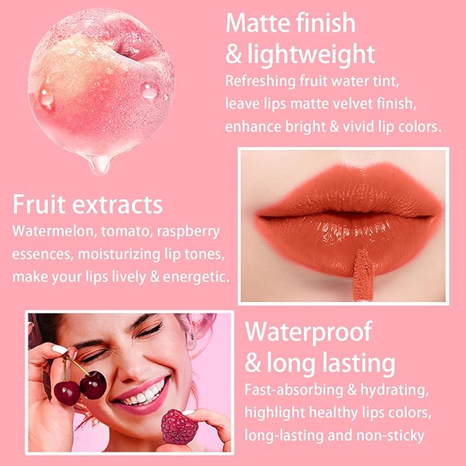 - 💋【Water Lip Tint】The velvet lip tint stain helps improve and enhance lip color, and highlight health skin tones. The smooth texture easily fit skin, effortlessly create a matte mist makeup effect.