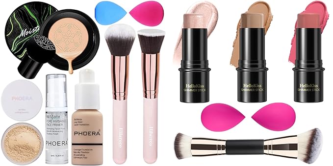 PHOERA Foundation,Mushroom Head Air Cushion CC Cream, PHOERA Primer, PHOERA Powder,3 Pcs Cream Contour Stick Makeup Kit, Shades with Highlighter Stick, Blush Stick and Bronzer Contour Stick