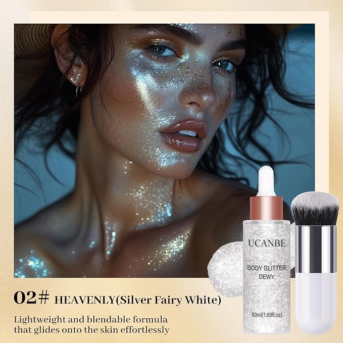 UCANBE Face Body Glitter Liquid Highlighter Illuminator Dewy Drops with Makeup Brush, Makeup Sparkle Shine Luminizer Enhancer Skin Body Shimmer Tint 50ml/1.69oz (02 Silver Fairy White, Standard)