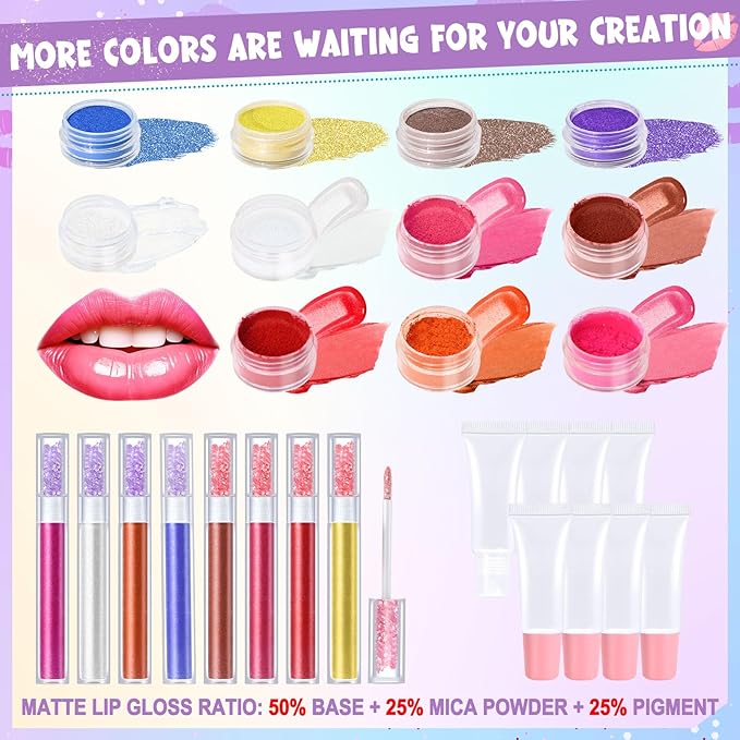 - CREATE YOUR UNIQUE LIP GLOSS KIT: You can DIY shimmer and matte lip gloss and make your own perfect shade and scent lip gloss. Whether you prefer a bold, bright color or a subtle, natural hue, this lip kit has everything you need to create your lipgloss uniquely yours. Matte lip gloss ratio: base liquid 50% + 25% pigment + 25% mica powder