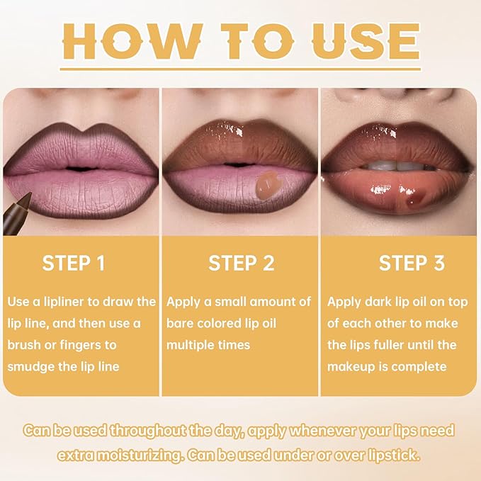 - Lustrous & Moisturizing: The lip glaze has hydrating and moisturizing ingredients . Applied on the lips can give the lips translucent gloss, full of moisture, plump and full. Create a charming and lovely pout lip effect.