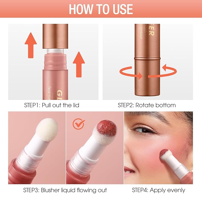 - Easy to use blush stick- 1.Open the lid 2.Twist the bottom clockwise, after that the liquid blush will appear on the applicator, then you can apply makeup directly. NOTE: Be sure not to twist the lid before opening it, otherwise the sponge applicator will stick to the lid!