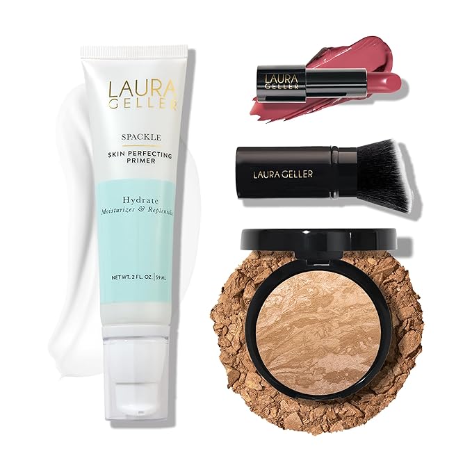 LAURA GELLER NEW YORK Effortless Essentials Kits -Cream Finish (4pc) Baked Balance-n-Brighten Foundation, Golden Medium+Spackle Makeup Primer, Hydrate+Modern Classic Cream Lipstick, Real Rosy+Kabuki