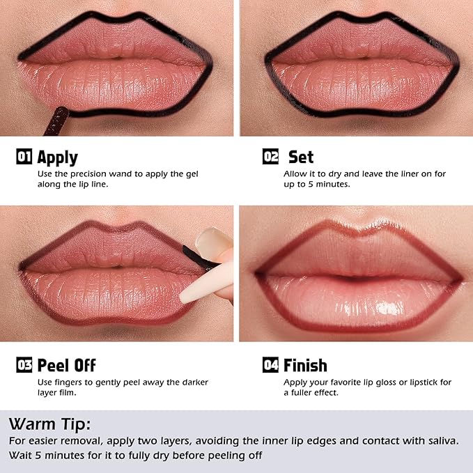 - EASY TO USE - Outline and fill in your lips with the lip stains. Wait for it to dry, then gently peel off for beautifully stained lips that last.(Warm Tip: For easier removal, apply two layers, avoiding the inner lip edges and contact with saliva. Wait 5 minutes for it to fully dry before peeling off.)