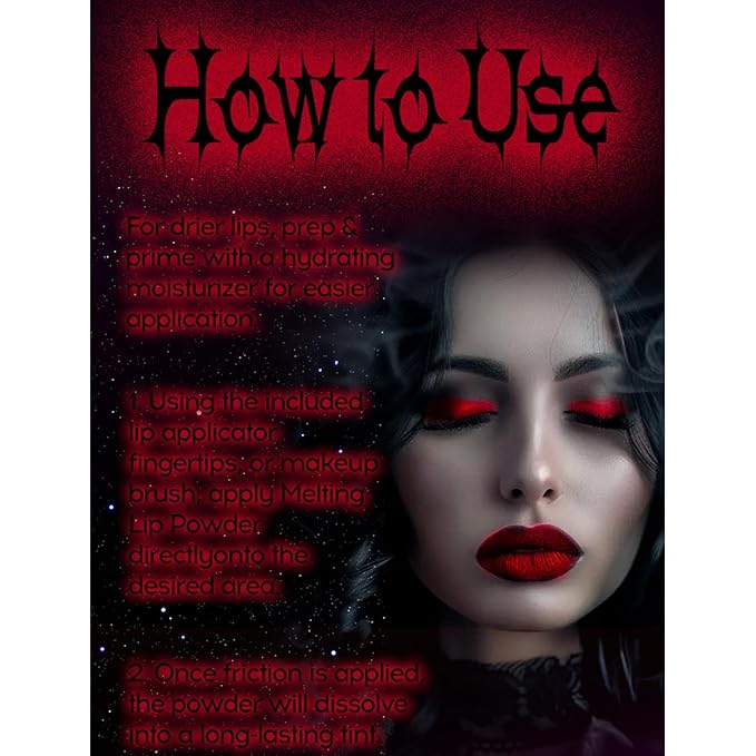 - 【How to Use】 For drier lips, prep & prime with a hydrating, moisturizer for easier application. 1.Using the included lip applicator, fingertips, or makeup brush, apply Melting Lip Powder directly onto the desired area. 2.Once friction is applied, the powder will dissolve into a long-lasting tint.
