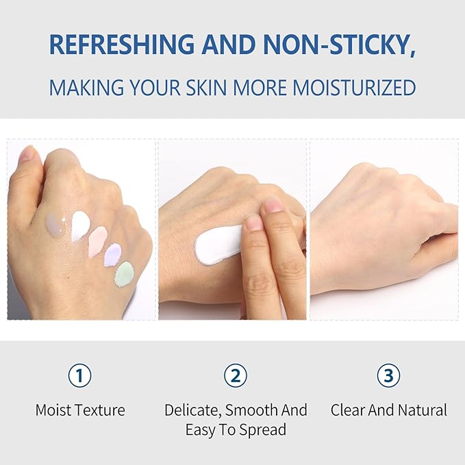 - MULTIPLE CHOICES: 5 different primers are available for you to choose from, including 01# white, 02# pink, 03# purple, 04# green and 05# blue. White can brighten the skin tone and slightly cover pores and fine lines. Pink can make dull skin healthy and rosy. Purple can brighten and even out the skin tone. Green can even out the skin tone and modify redness. Blue can moisturize and hydrate.