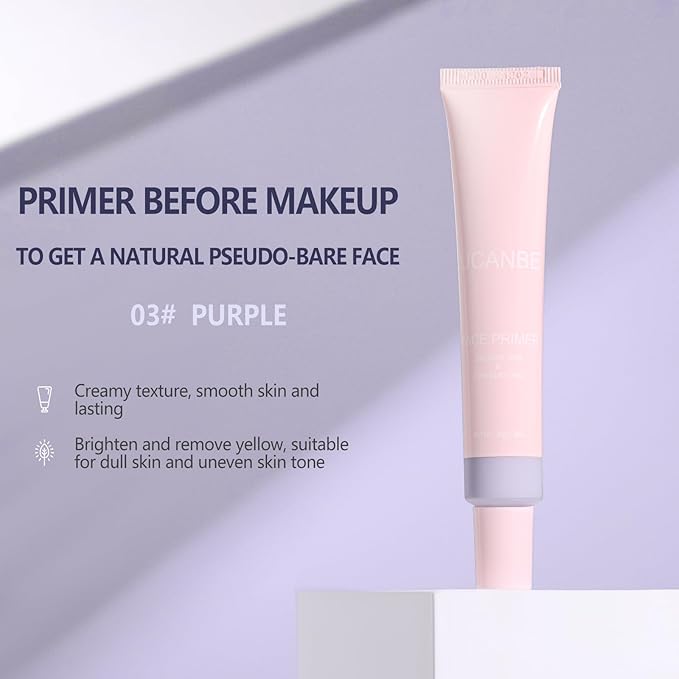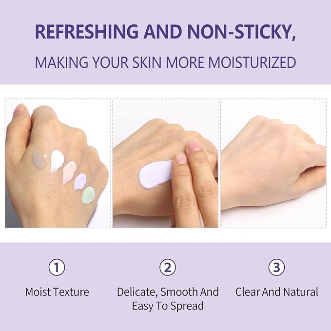 - MULTIPLE CHOICES: 5 different primers are available for you to choose from, including 01# white, 02# pink, 03# purple, 04# green and 05# blue. White can brighten the skin tone and slightly cover pores and fine lines. Pink can make dull skin healthy and rosy. Purple can brighten and even out the skin tone. Green can even out the skin tone and modify redness. Blue can moisturize and hydrate.