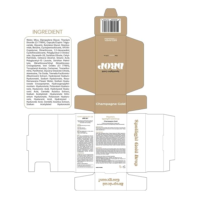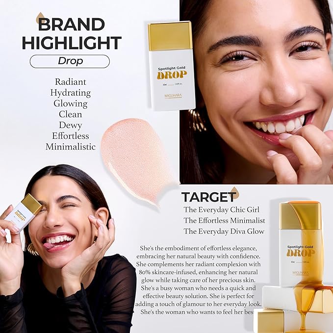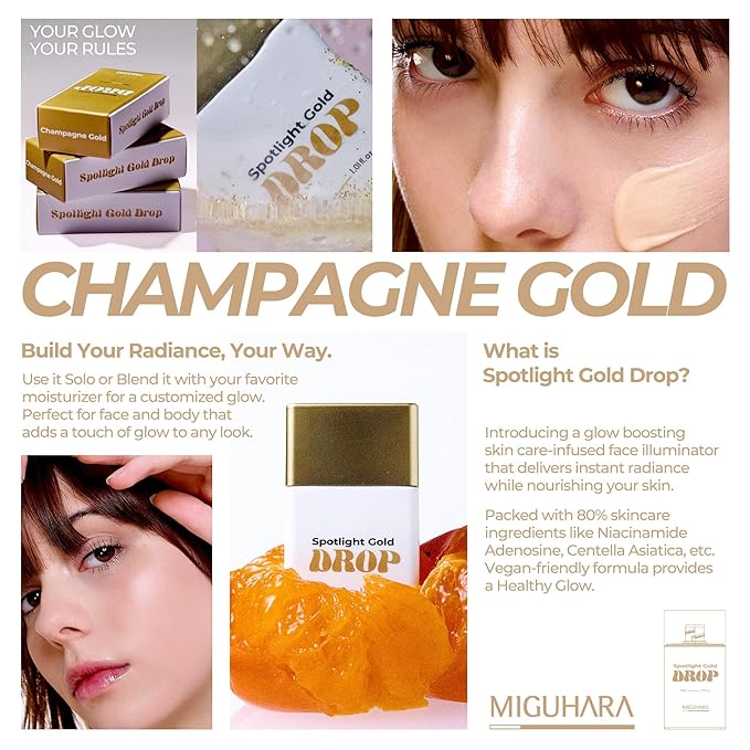 - Radiant Glow: Miguhara's Spotlight Gold Drop is a champagne gold illuminator that instantly glow and enhances your complexion with a radiant, glowy finish.