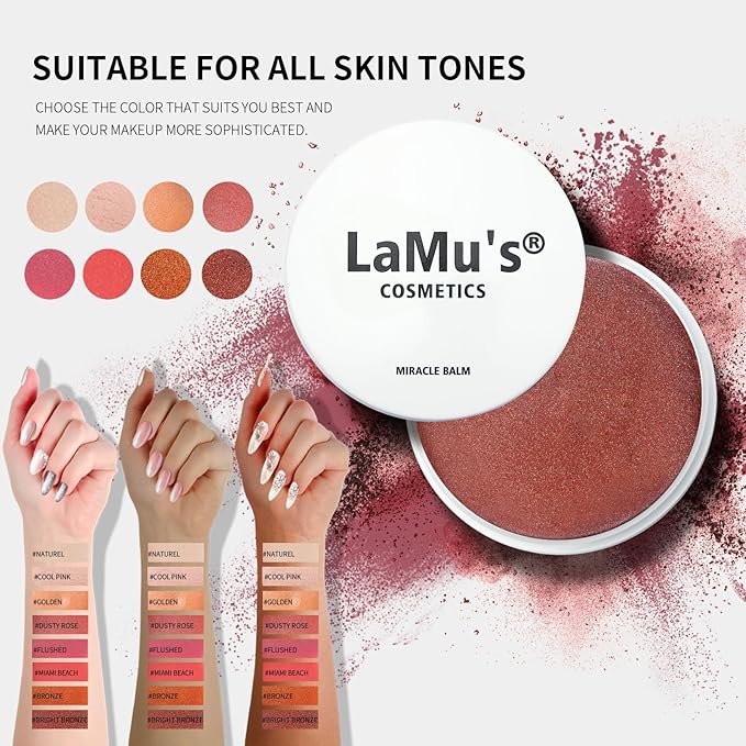 - Multipurpose Balm: Lamu's Cosmetics Moisturizing Miracle Balm is a versatile face balm that can be used as a cream blush for a radiant, natural glow.