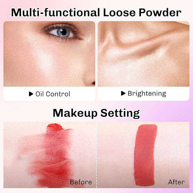 - All-Weather Loose Powder: The setting powder can be worn all day long, with a fine, soft texture that adheres to the skin, won't easily come off, and effectively locks in eye makeup and foundation