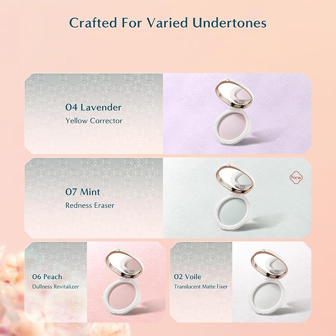 - Shade Description: (02 Voile) Translucent matte for all complexion. (04 Lavender) Light purple matte for dullness reduction. (06 Peach) Soft pink with subtle shimmer for undertone brightness. (07 Mint) Pale green matte for redness neutralization.