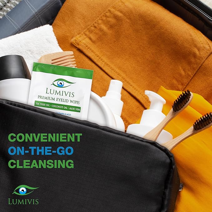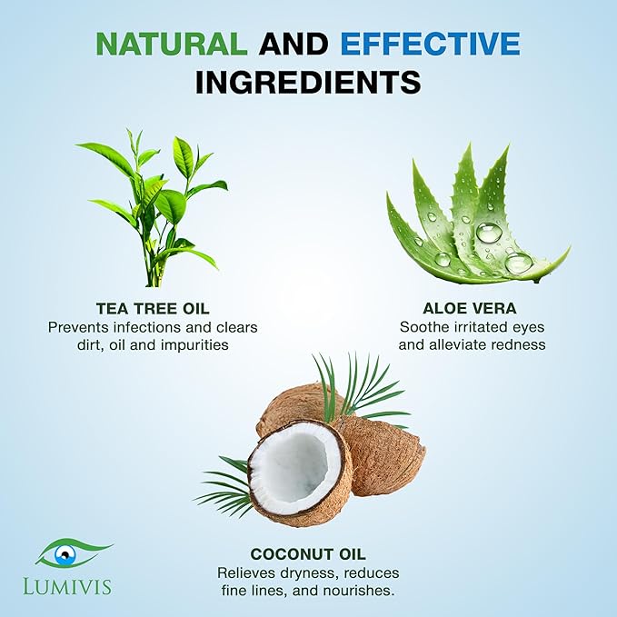 - GENTLE DAILY EYE CLEANSING - Lumivis Tea Tree Oil Eyelid Wipes are designed for daily cleansing of eyelids and lashes. Made with natural ingredients like tea tree oil and aloe vera, they help remove oil, dirt, and buildup with ease