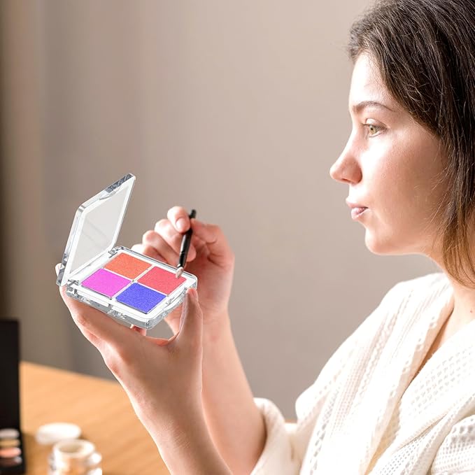 - Package Contents: You're going to love this 2-piece transparent 4-color eyeshadow box! This depotting makeup containers designed with four grids to store different colors, and the lid fits the edge perfectly, sealing the powder well to prevent unnecessary leakage. This empty makeup palette is a must-have for daily makeup
