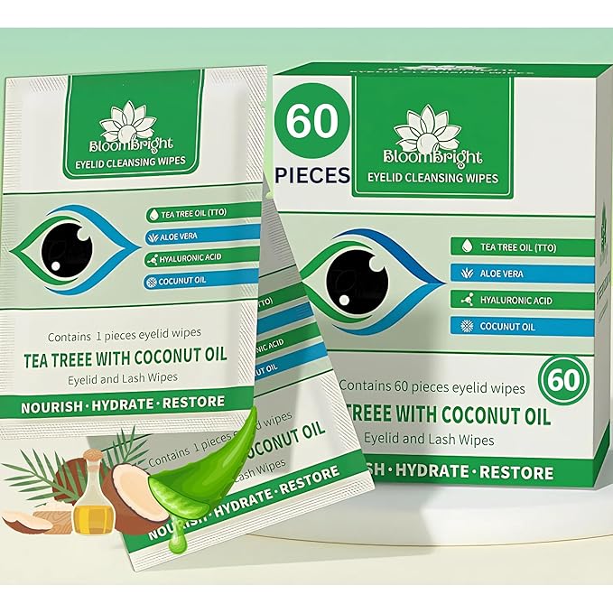 60 Pcs Tea Tree Oil Eyelid Cleansing Lash Wipes with Coconut Hyaluronic Acid Green Tea Chamomile Aloe Vera Itchy Stye Eyes Relief Natural Individually Wrapped Makeup Remover Daily Cleanser