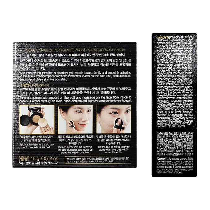 - [KOREAN CUSHION FOUNDATION WITH NOURISHING INGREDIENTS] Farmstay Black Snail & Peptide 9 Perfect Cushion is a skin-loving foundation infused with Black Snail Extract and Peptide 9 Complex, helping to moisturize and refine skin texture while delivering a flawless complexion.
