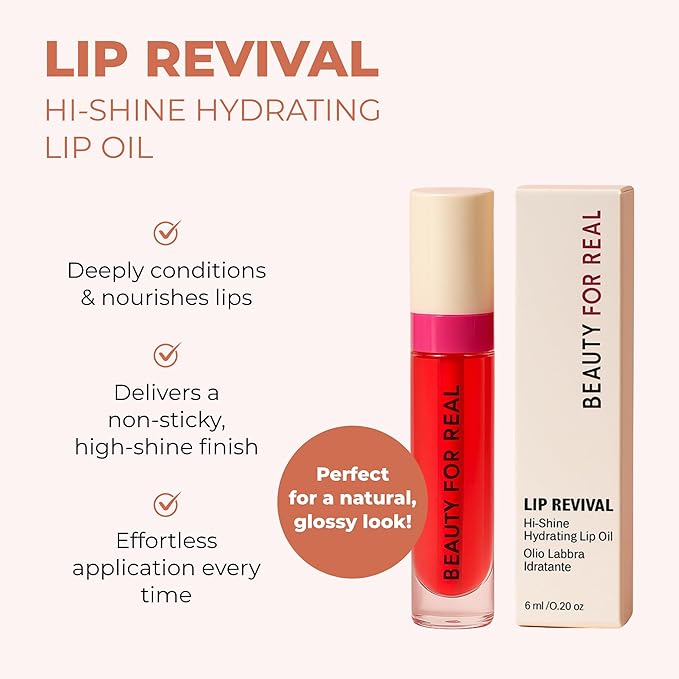 Beauty For Real Lip Revival Hi-Shine Hydrating Lip Oil, Strawberry Fields (Transparent Red) - Lightweight - Non-Sticky, Shiny Finish - Paraben Free, Cruelty Free, Vegan